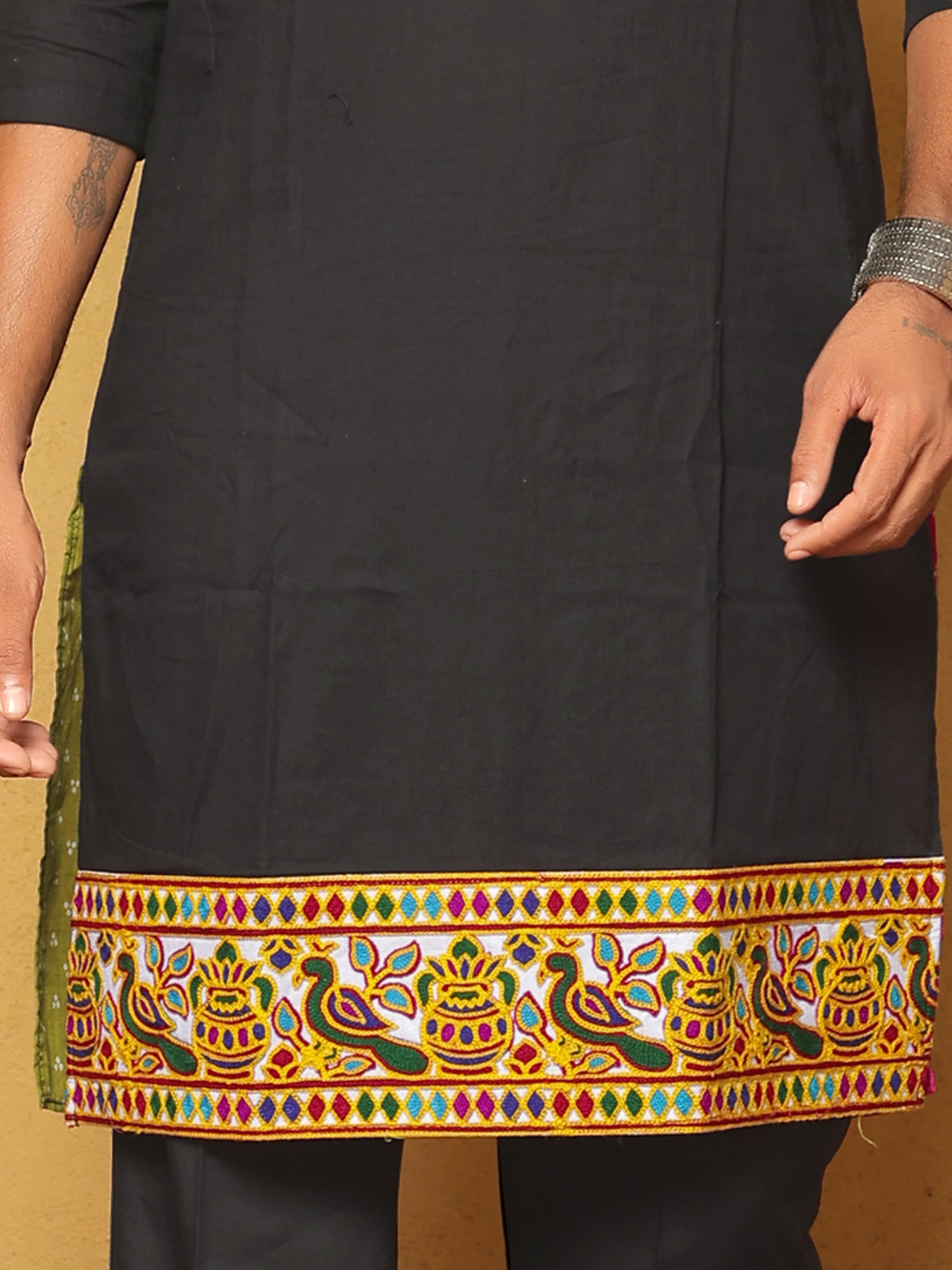Make a bold style statement with this black premium cotton-blend kurta from Varbandhan, featuring a solid embroidered front hem and a vibrant Bandhani-inspired printed back panel. The fusion of classic elegance and colorful festive charm makes this kurta a standout choice for cultural and celebratory occasions.