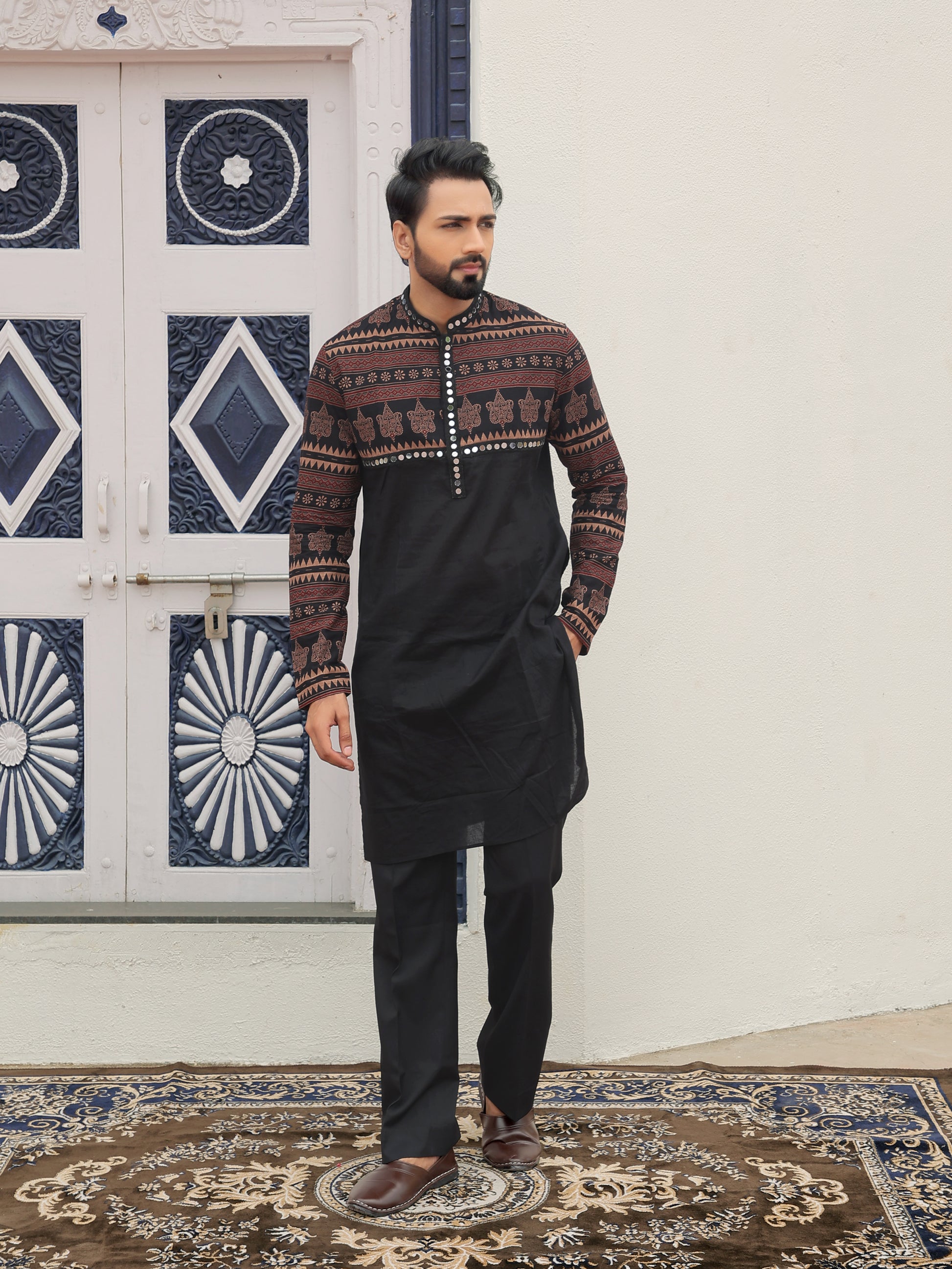 Make a bold statement with this black ethnic printed kurta featuring a striking tribal-inspired print on the yoke and sleeves. Crafted from a premium cotton-blend fabric, it delivers both comfort and elegance, making it an ideal choice for festive occasions, weddings, and cultural celebrations.