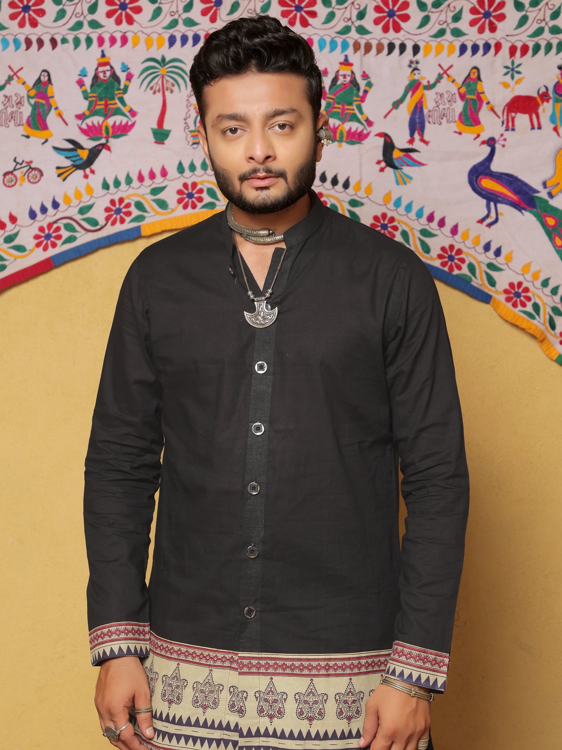 - Rich black base with traditional ethnic printed border
