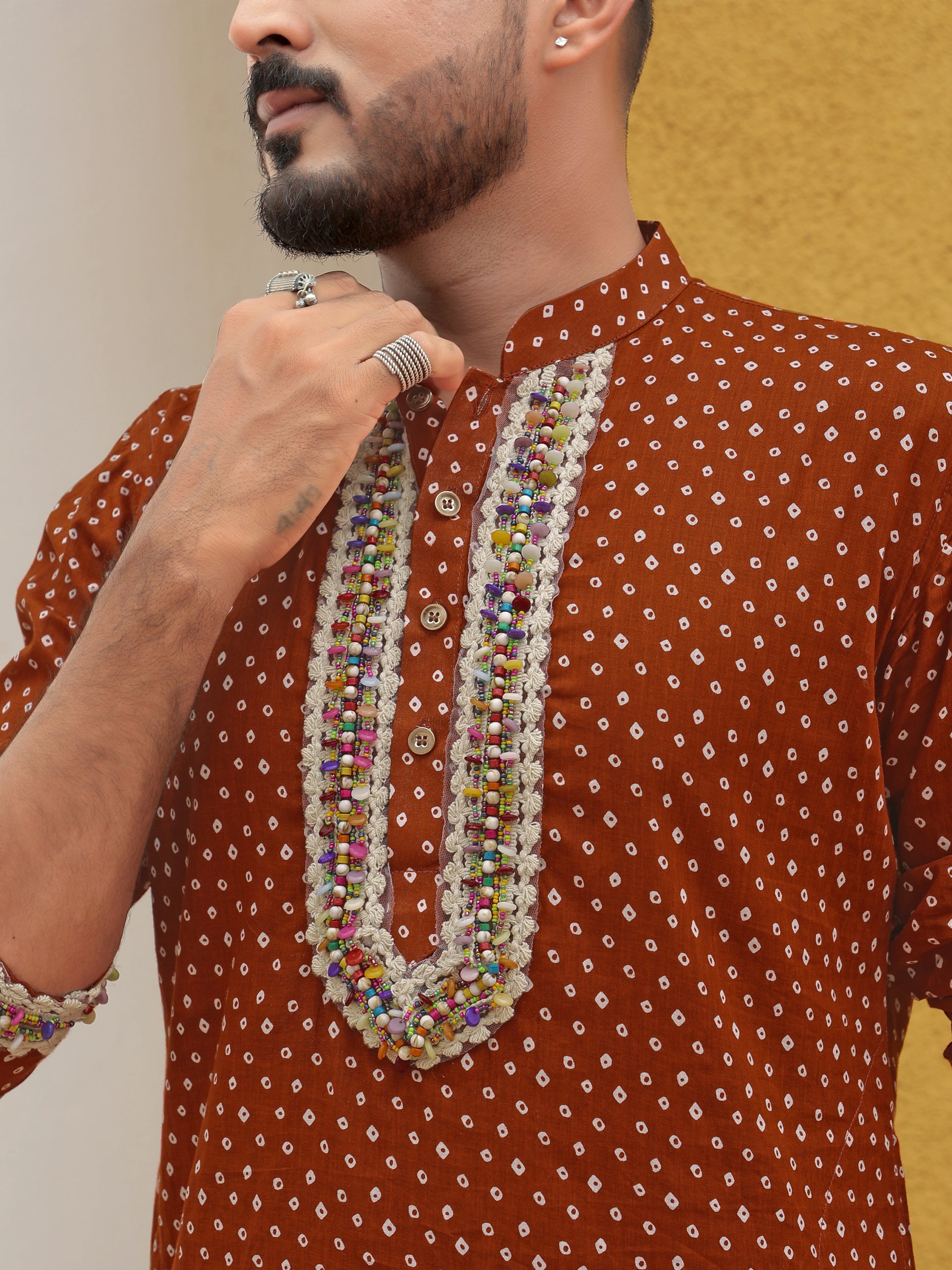 Step into festive elegance with this brown embroidered kurta from Varbandhan. Featuring all-over ethnic prints and intricate embroidery on the neckline, this kurta is a perfect mix of modern sophistication and timeless tradition. Designed for weddings, poojas, and festive occasions, it offers both style and comfort.