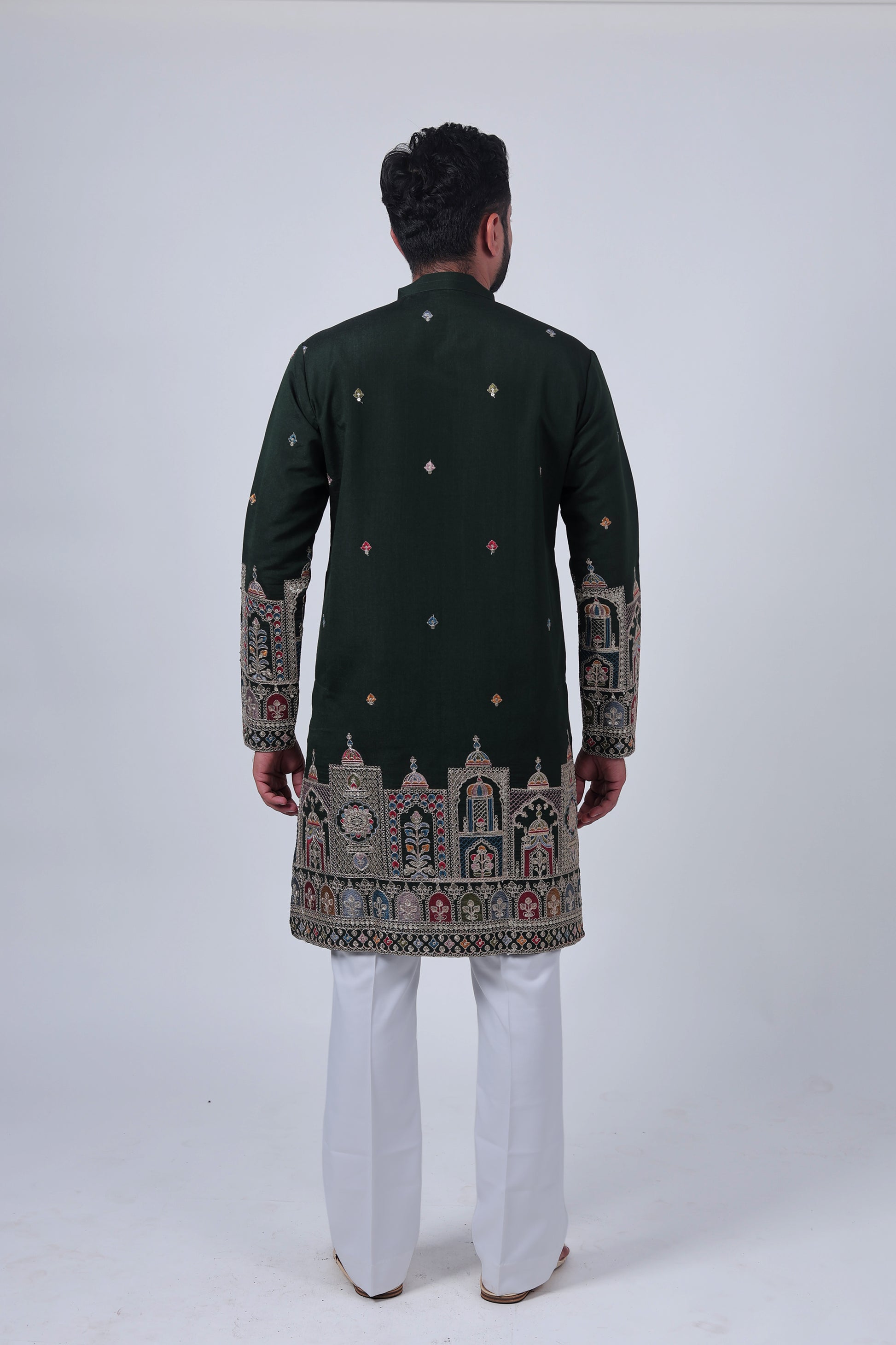 This luxurious green kurta radiates festive elegance. Crafted from rayon with a metallic finish, it features grand temple-style zari embroidery and intricate mirror work on the hem and sleeves—perfect for weddings and special occasions.