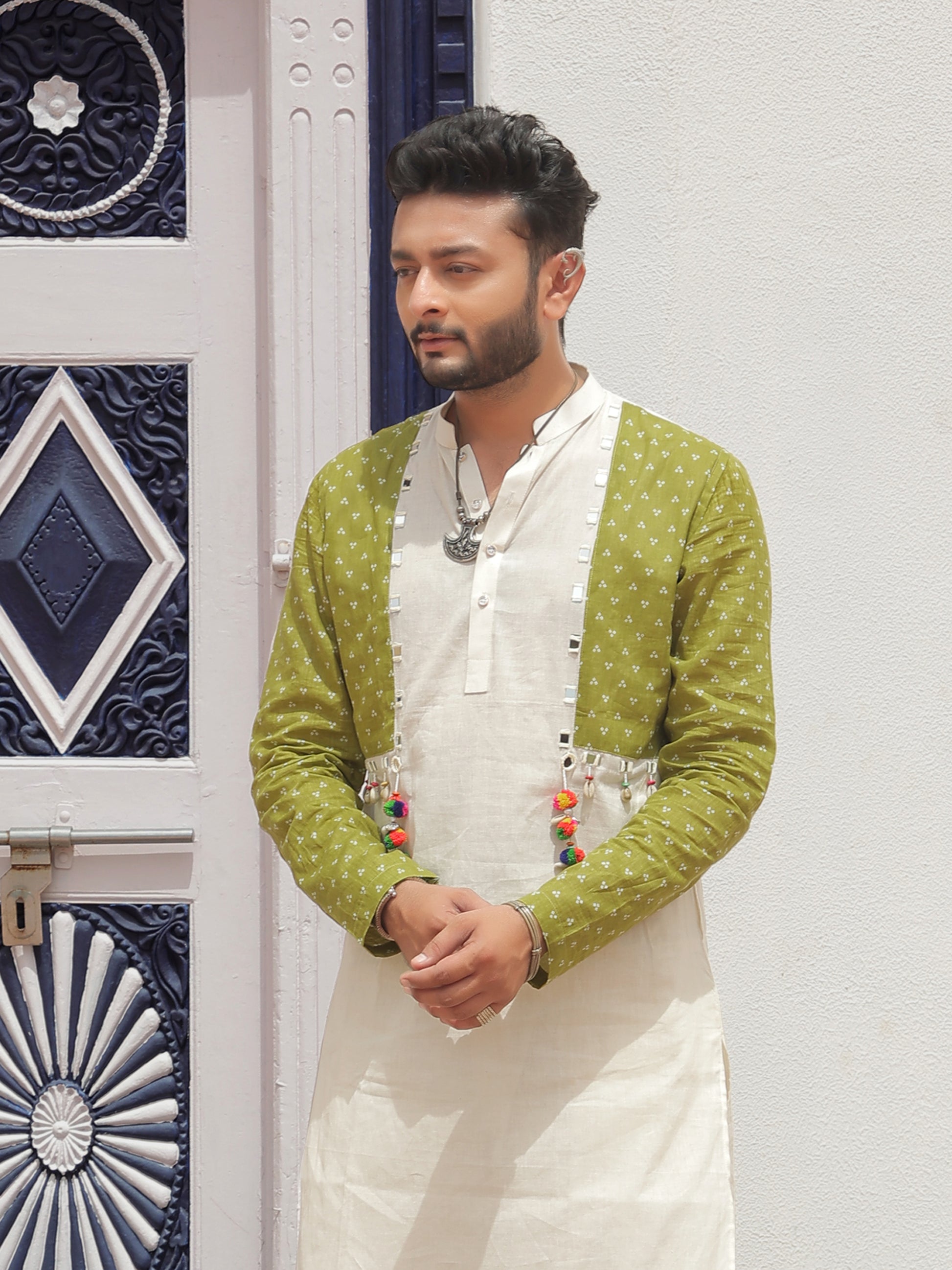 Step into celebrations with this green jacket-style kurta from Varbandhan. Designed with ethnic printed motifs and colorful tassel embellishments, this kurta blends vibrant tradition with modern elegance, making it perfect for festive rituals and wedding functions.