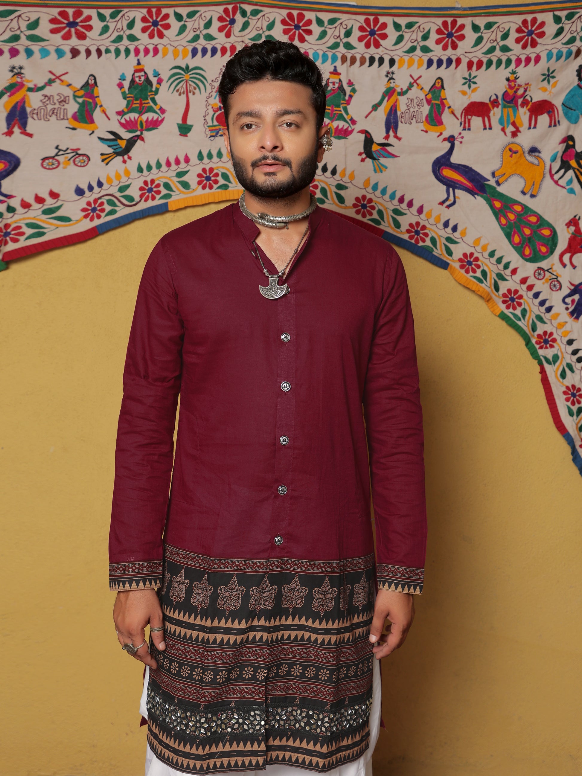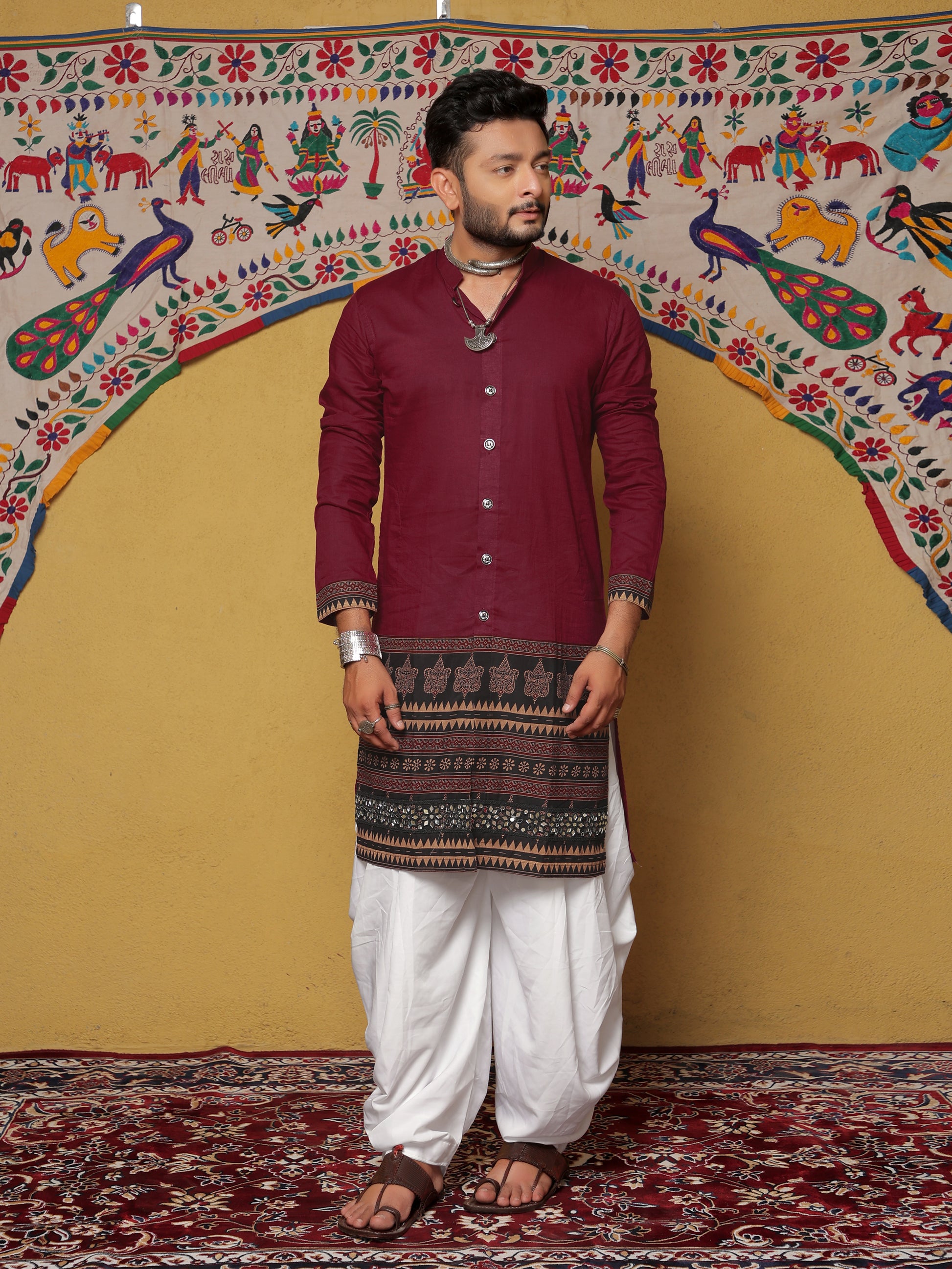 Step into elegance with this maroon kurta adorned with traditional ethnic printed motifs. Designed from premium cotton-blend fabric, it ensures both comfort and sophistication. The mandarin collar with a full button placket highlights its refined styling, while the matching salwar completes the festive ensemble.