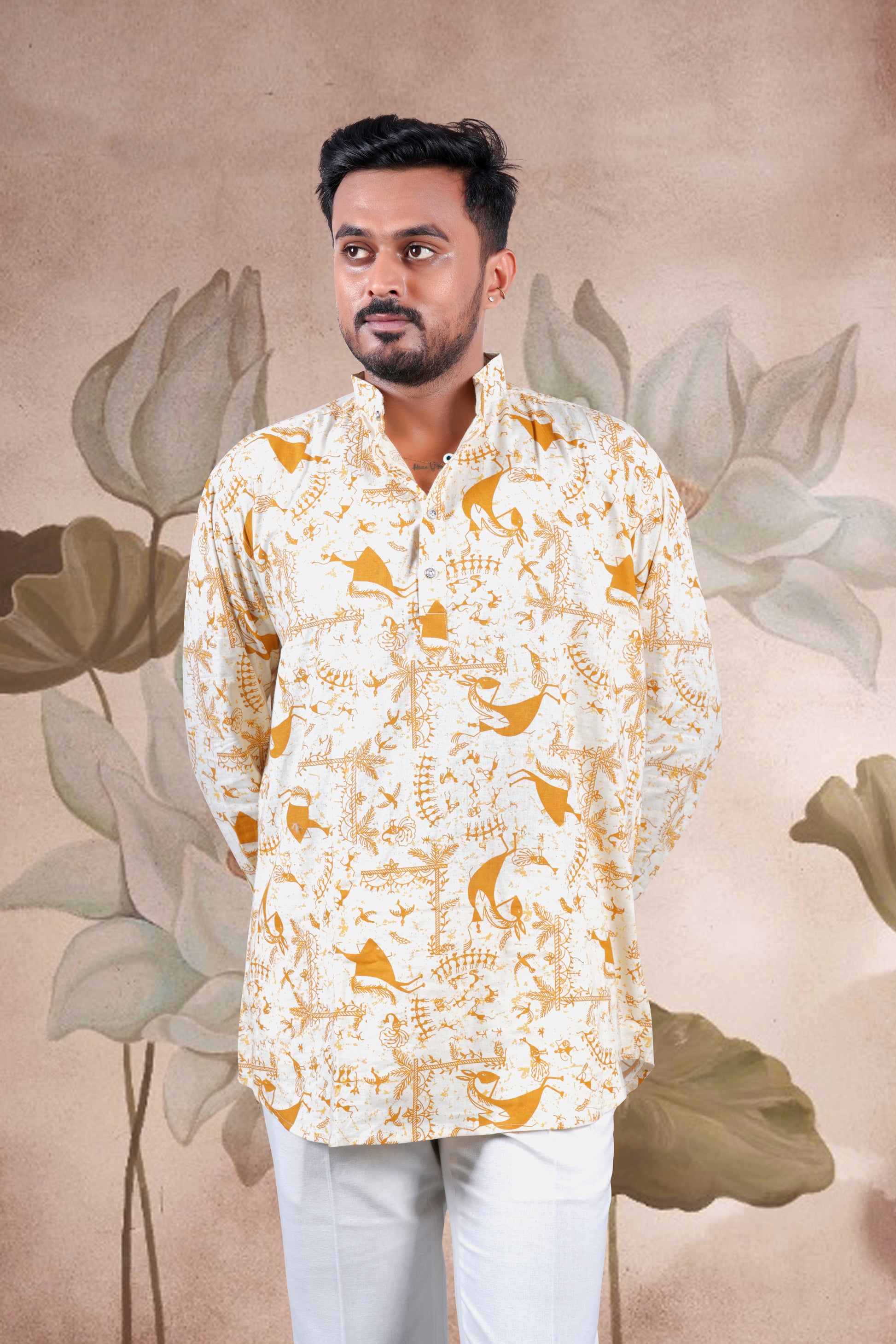 Mustard Warli Print Cotton Short Kurta