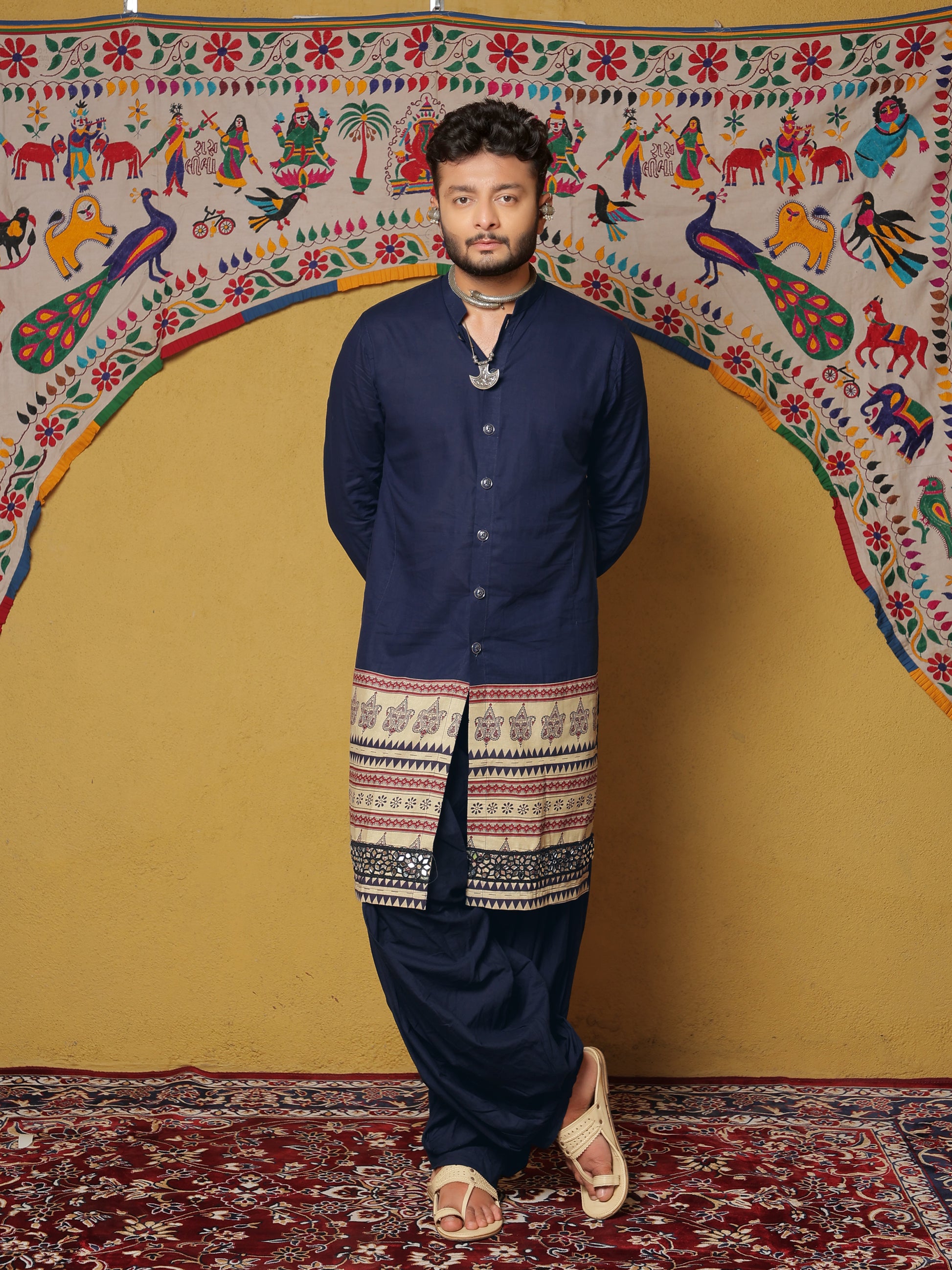 Elevate your festive style with this navy kurta featuring traditional ethnic printed motifs along the border. Crafted in a premium cotton-blend fabric, it offers a refined silhouette with comfort and breathability for all-day wear. The mandarin collar and full button placket enhance its elegant charm, making it perfect for weddings, cultural gatherings, and festive occasions.