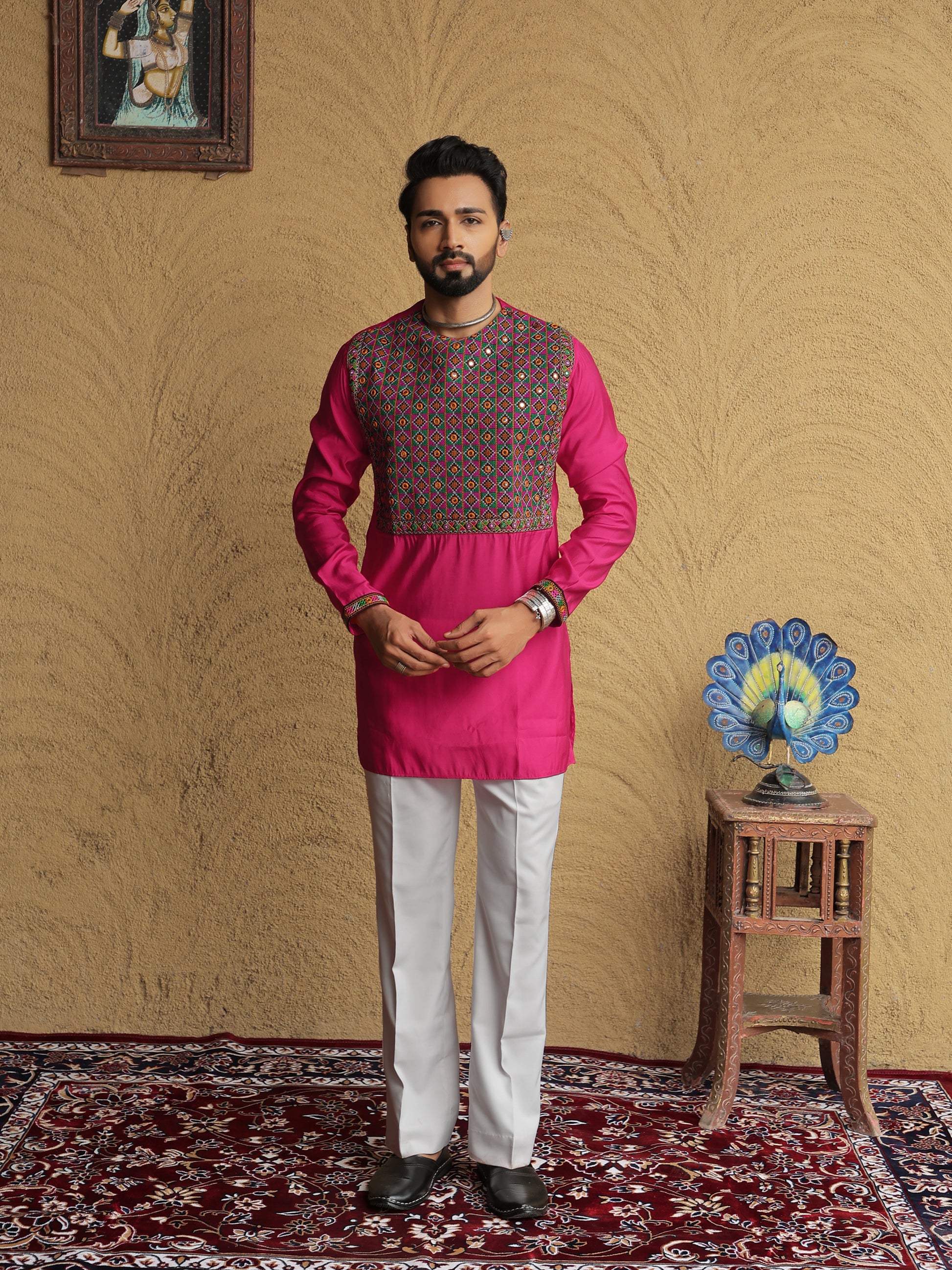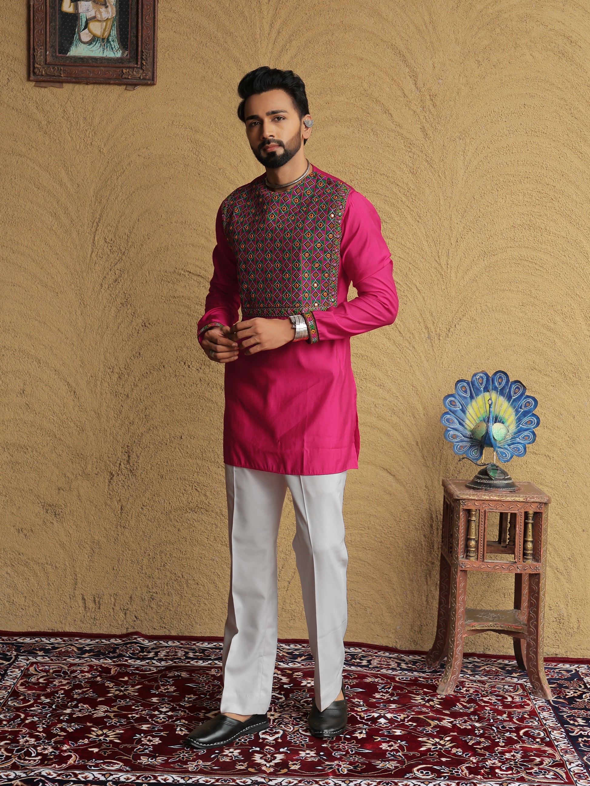 Elevate your festive style with this pink embroidered kurta from Varbandhan. Crafted with an intricately multicolor geometric embroidered yoke panel and matching embroidered sleeve cuffs, this kurta strikes the perfect balance of elegance and tradition. The refined mandarin collar adds sophistication, making it a versatile choice for weddings, celebrations, and festive gatherings.