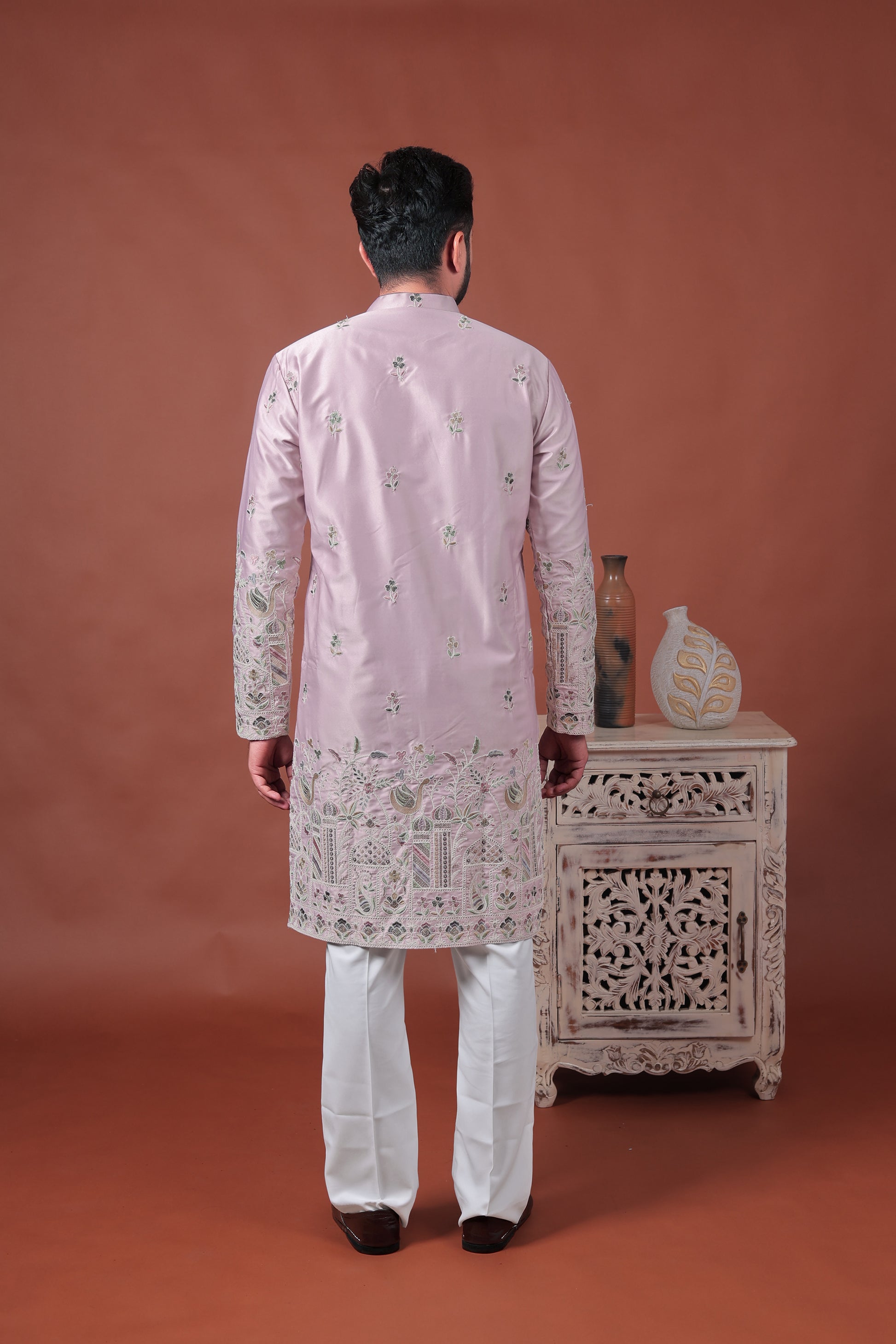 Step into tradition with this vibrant pink satin kurta from Varbandhan, exquisitely embroidered with floral and Mughal-inspired motifs. Intricate multicolor threadwork enhances the hem, sleeves, and chest area, adding regal charm to your festive ensemble.