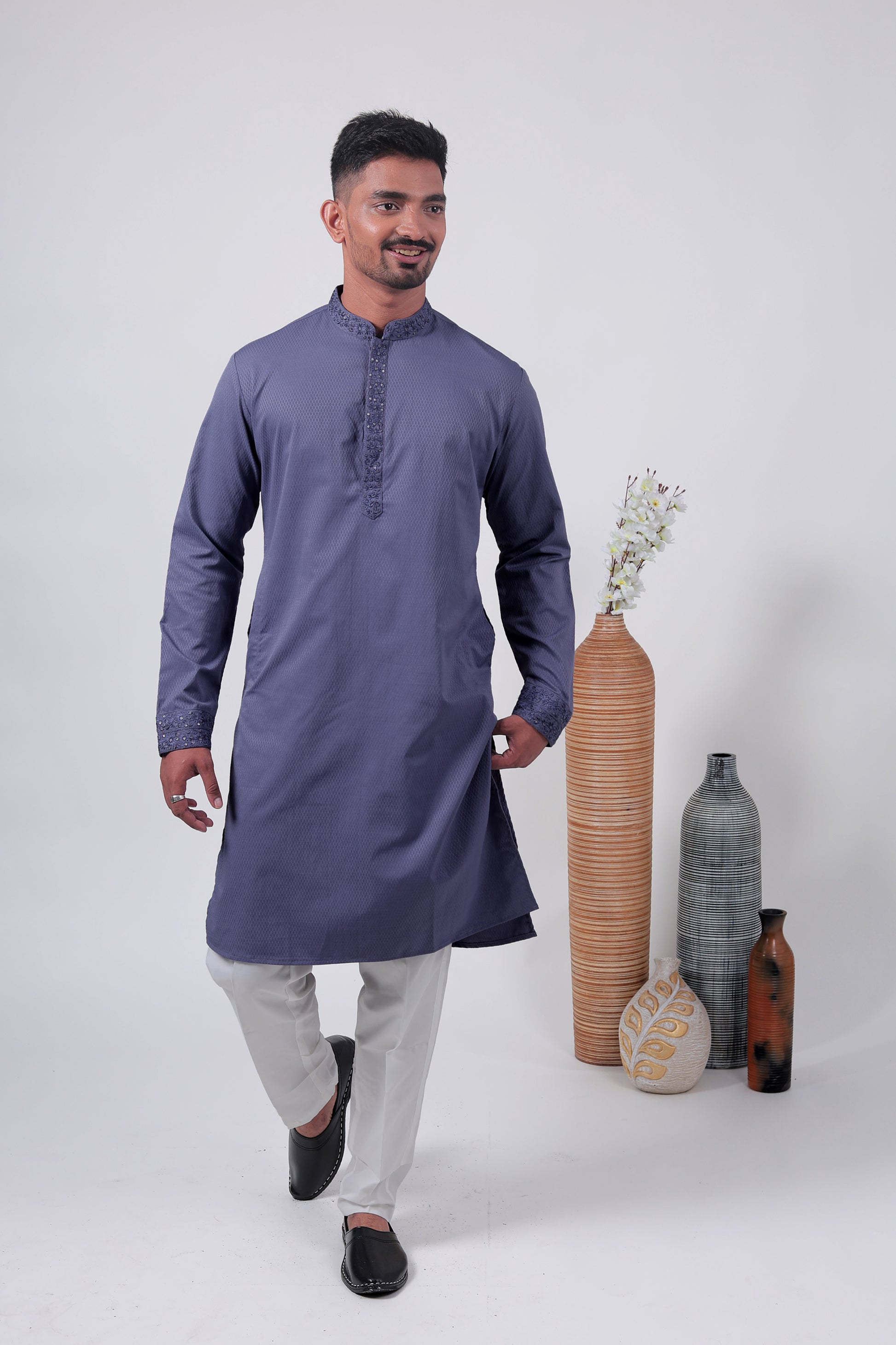 Step into elegance with this purple cotton silk kurta featuring a rich self-textured weave and subtle embroidery on the placket and sleeve cuffs – ideal for festive and cultural occasions.