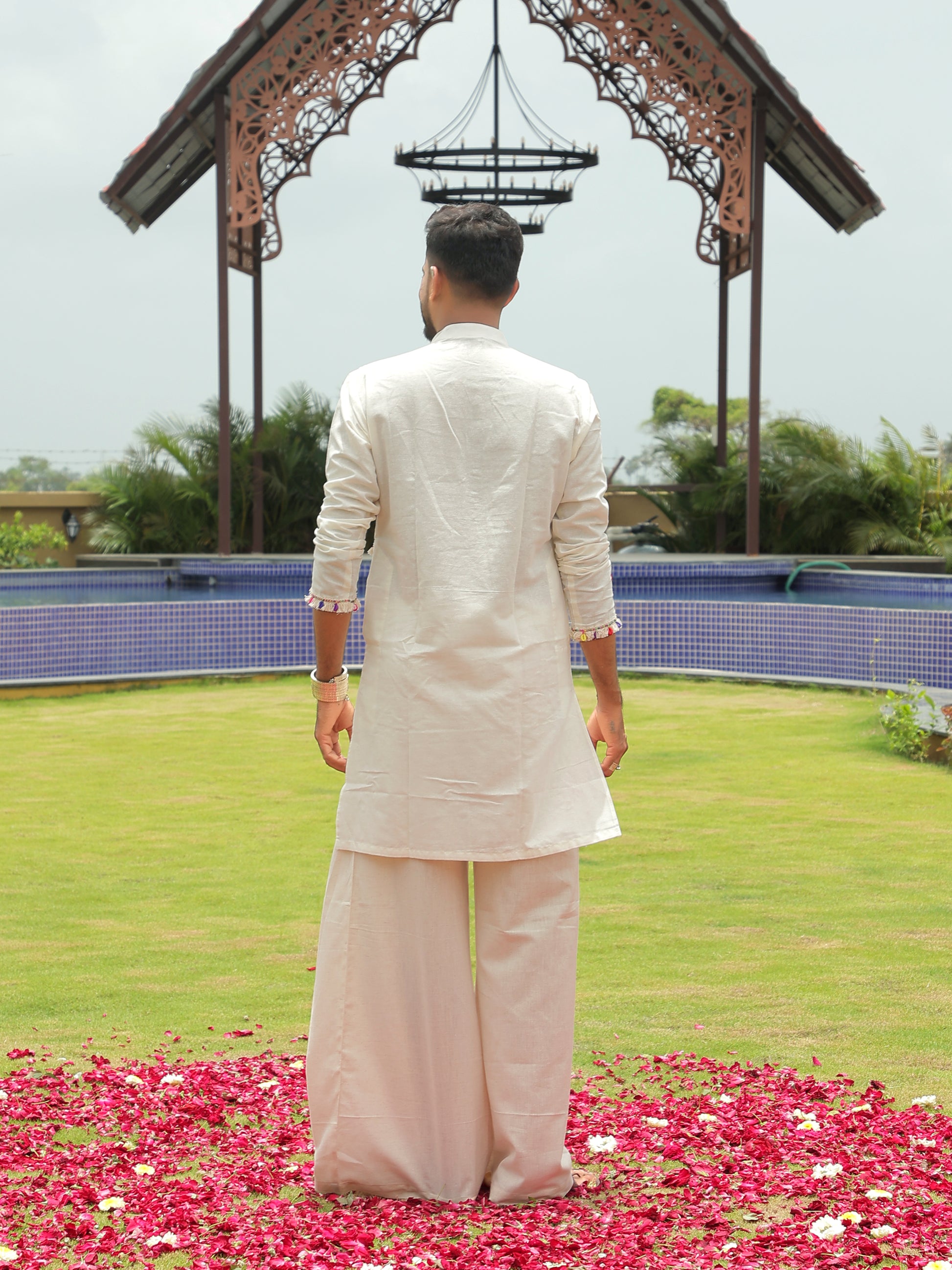 Elevate your festive look with this exquisite white kurta from Varbandhan, featuring a Bandhani-inspired panel with intricate multicolor embroidery. Crafted from a premium cotton-silk blend, it offers a soft sheen, luxurious comfort, and a refined festive appeal. The unique asymmetrical panel design with mirror work and tassel accents makes this kurta a true statement piece.